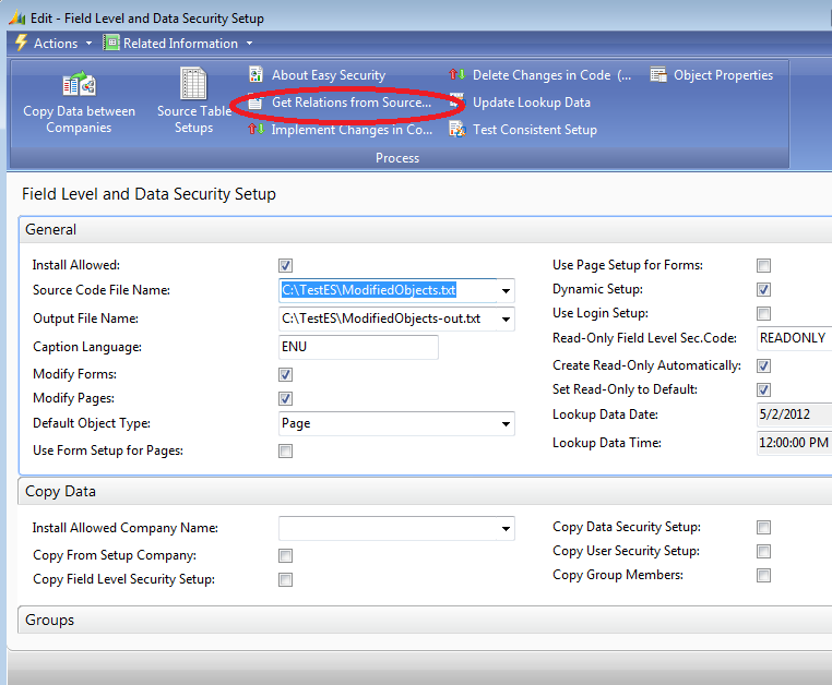 Field Level and Data Security has already been completed. See the following link to determine when the update is necessary. When To update Source Code Analysis In the Easy Security Company, in Field Level and Data Security Setup, enter a text file name containing either ALL objects exported from object designer, or the text file may contain only objects modified since the last time SCA was updated.Select Get Relations from Source Code.