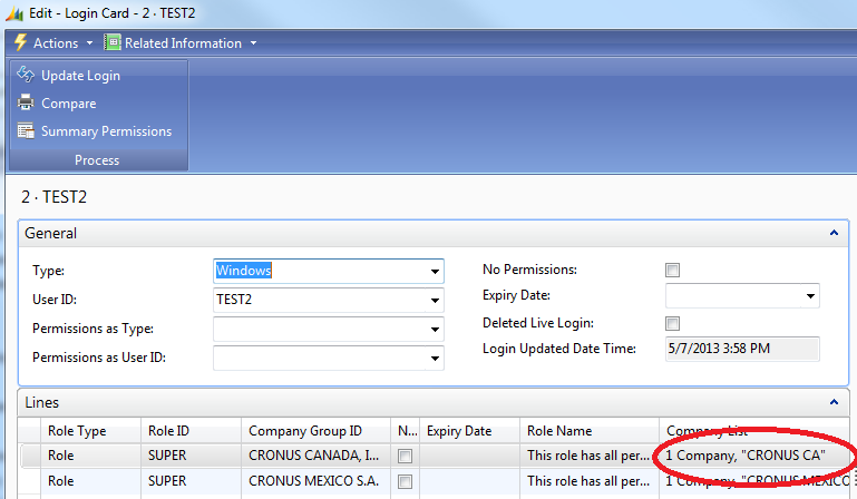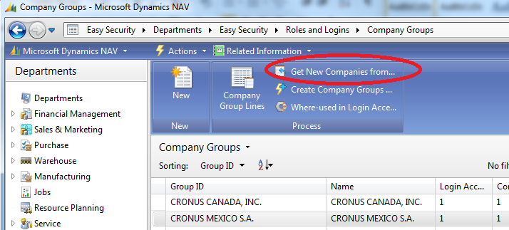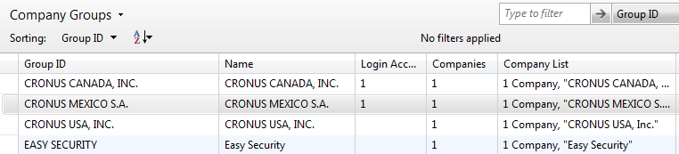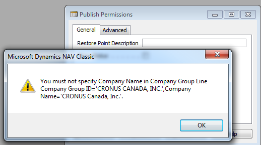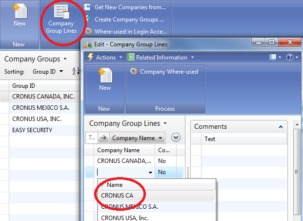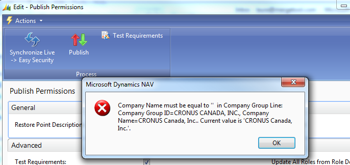 The reason for the error is that Company Groups were created when Easy Security was installed and one of them is referring to the original company name. Since renaming, this company name no longer exists. For example, I have renamed CRONUS CANADA, INC. to CRONUS CA, but my company group record still has the previous name.