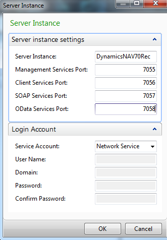 In the Actions in the right pane, click on Add Instance. Give the new instance a unique name (I added Rec to the name) and change the port numbers to any available ports that do not conflict with the default NAV instance ports of 7045 7046 7047 7048. Add the service account here as well.